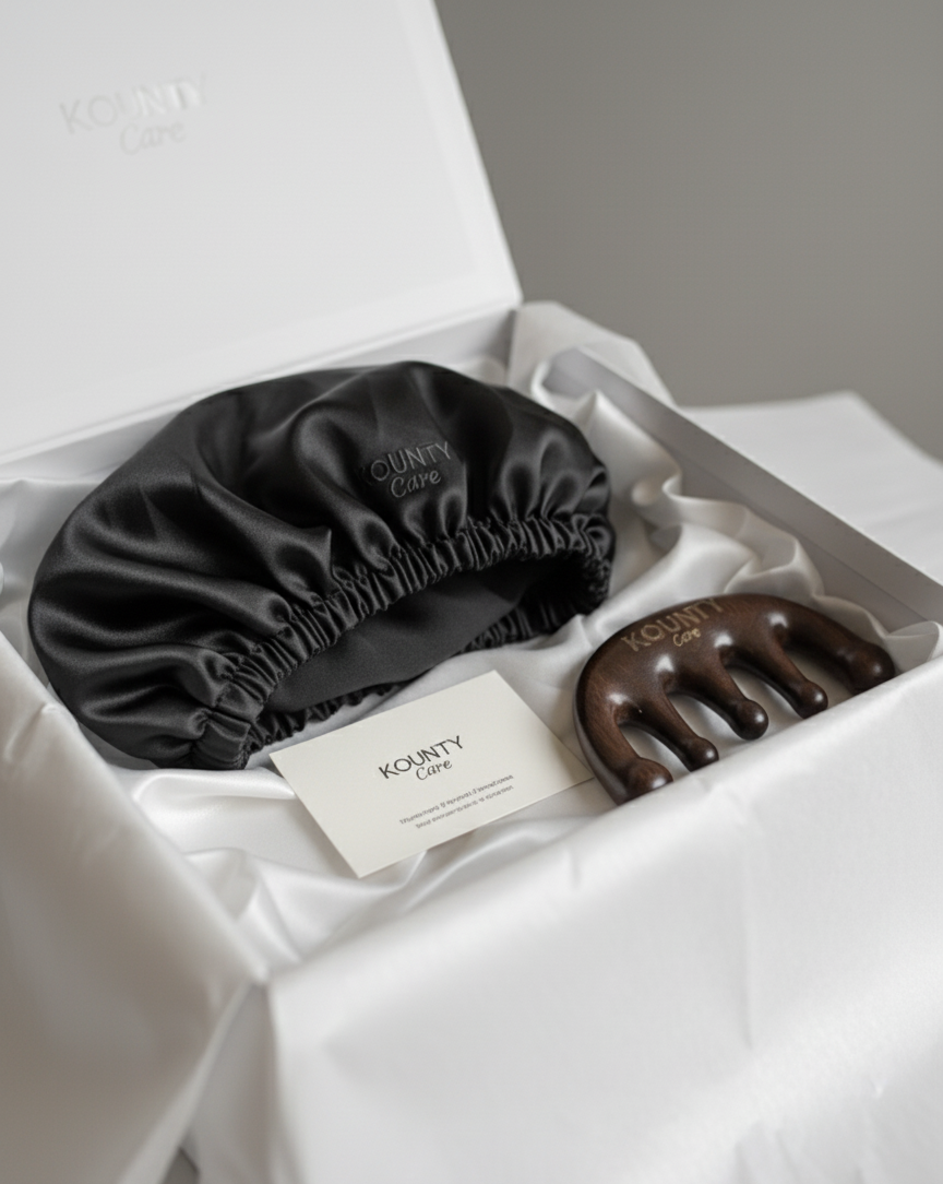 « Saviez-vous que les fibres naturelles préservent jusqu’à 40 % mieux l’hydratation des cheveux que les matières synthétiques ? Chez Kounty Care, nous avons fait le choix des matières durables et respectueuses de nos rituels de soin. »